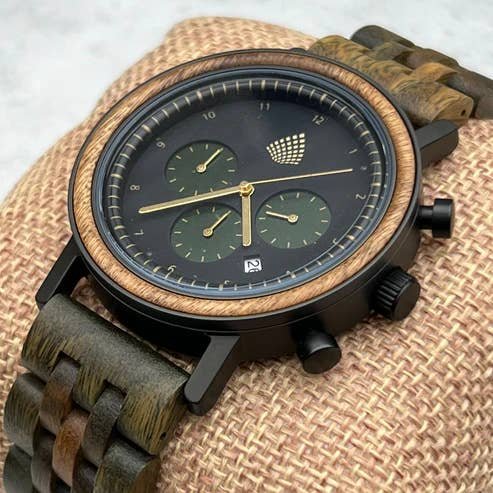 Designed to be kinder to the environment, this watch is handmade from recycled natural wood furniture and is completely vegan. It features a tough matte black body with a black dial and dark green stopwatch sub-dials, framed by a dark brown wooden ring with gold accents. The rich dark brown strap complements the sophisticated design, crafted using sustainable materials and delivered in environmentally friendly packaging.