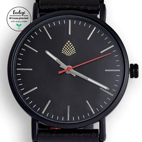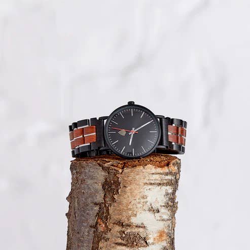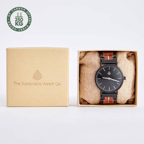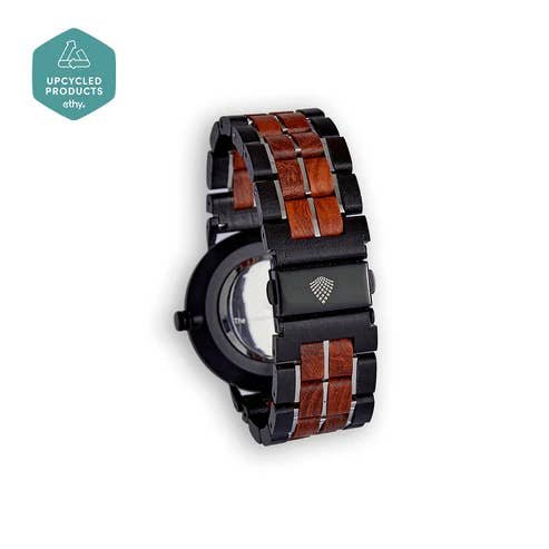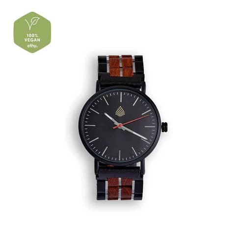 Handmade from recycled natural wood furniture, The Rowan features a sleek and minimal dial, making it a perfect everyday sustainable accessory. The watch body is paired with an elegant band combining deep red sandalwood and sophisticated ebony, enhanced by subtle silver accents throughout. Crafted from sustainable, vegan materials and delivered in environmentally friendly packaging.