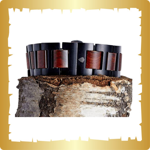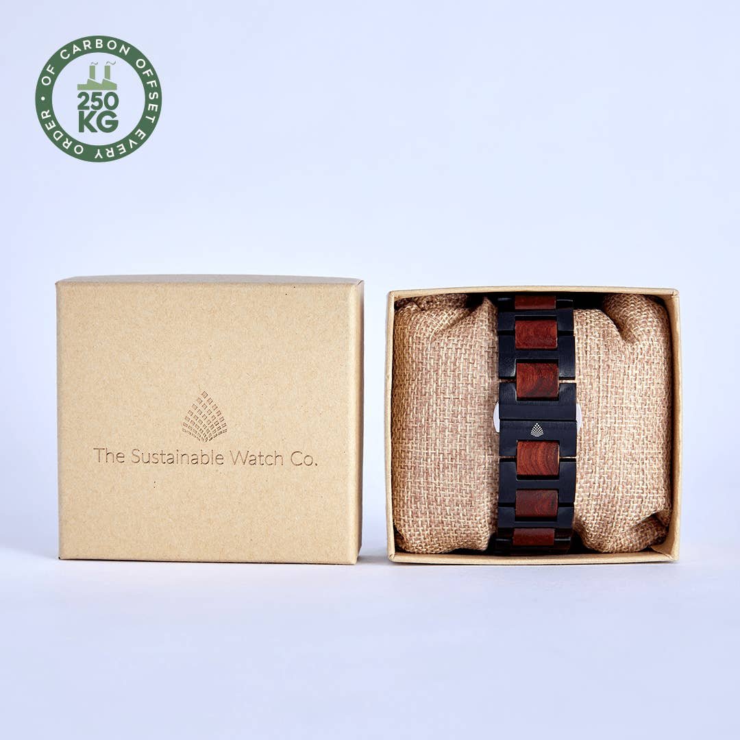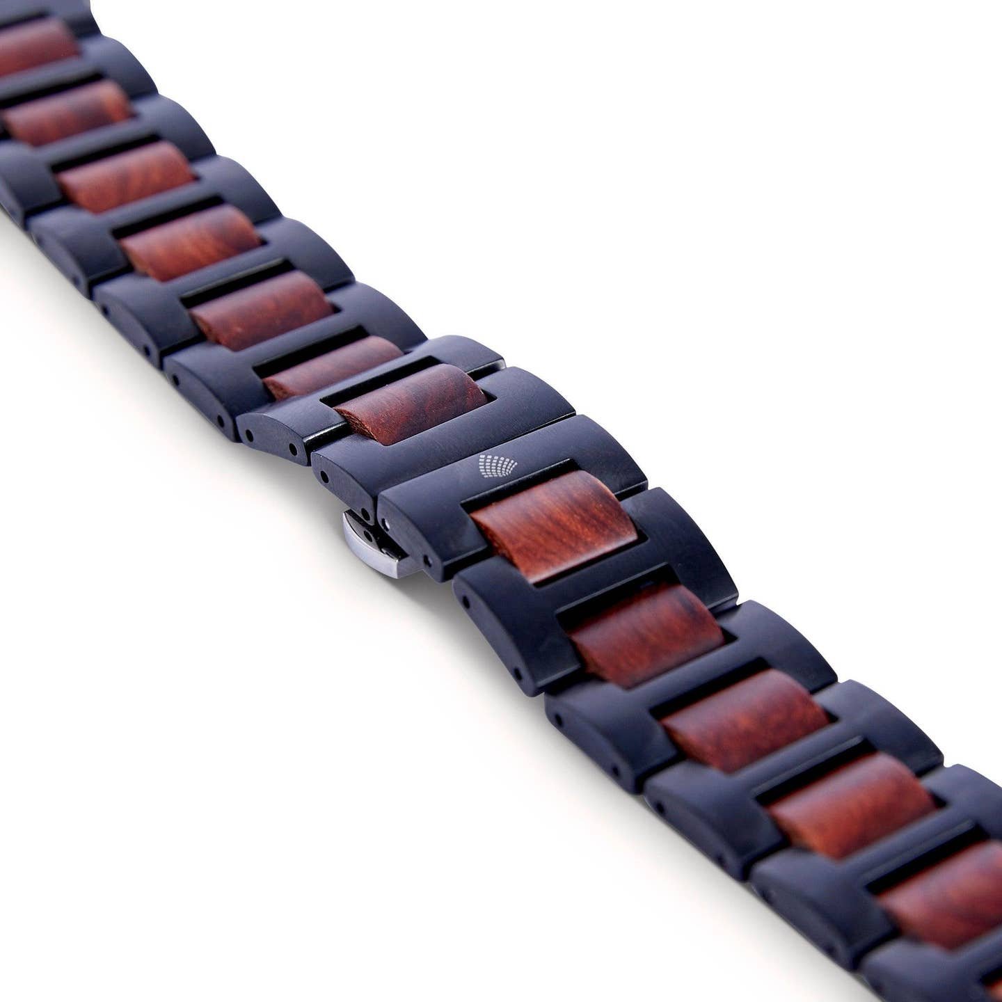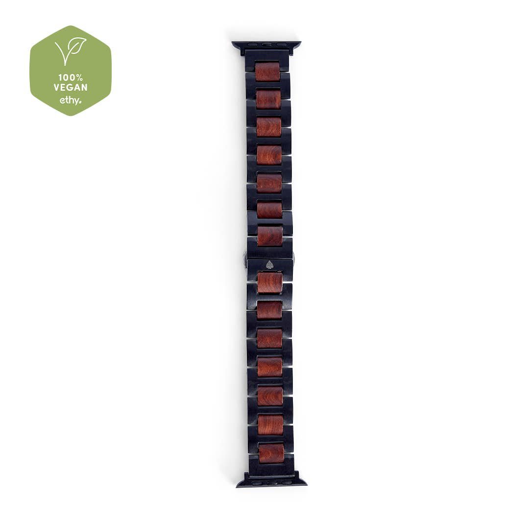 Handmade from recycled natural wood furniture, this Apple Watch strap features a deep colour palette of reds, browns and black suited to a variety of occasions. Reinforced black metal links surround the natural red sandalwood for extra durability, while the hidden clasp keeps the design sleek and uninterrupted. Crafted from sustainable, vegan materials and delivered in environmentally friendly packaging.